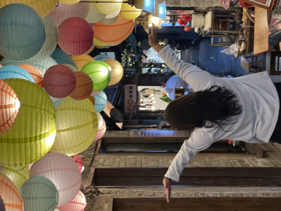 A solitary individual stands centered in a narrow, brick-lined pedestrian alleyway in Yuzhong District, China, facing away from the camera. The person, with long, dark hair, is dressed in a light-colored, long-sleeved shirt and has both arms outstretched horizontally with palms facing upward. Above, a dense canopy of various-sized, illuminated spherical paper lanterns in hues of pink, green, yellow, blue, orange, and light purple hangs low, providing the primary light source. The alley walls are constructed of light-toned bricks, interspersed with dark wooden doorways and window frames. To the right, a commercial display features stacked white ceramic plates, a small vase with artificial red roses, and multiple hanging lamps with blue and amber glass shades. Additional wooden stools and small items are visible on a lower shelf or table to the right. The alley extends into the background, dimly lit, with blurred outlines of further establishments. The setting appears to be an evening scene.
