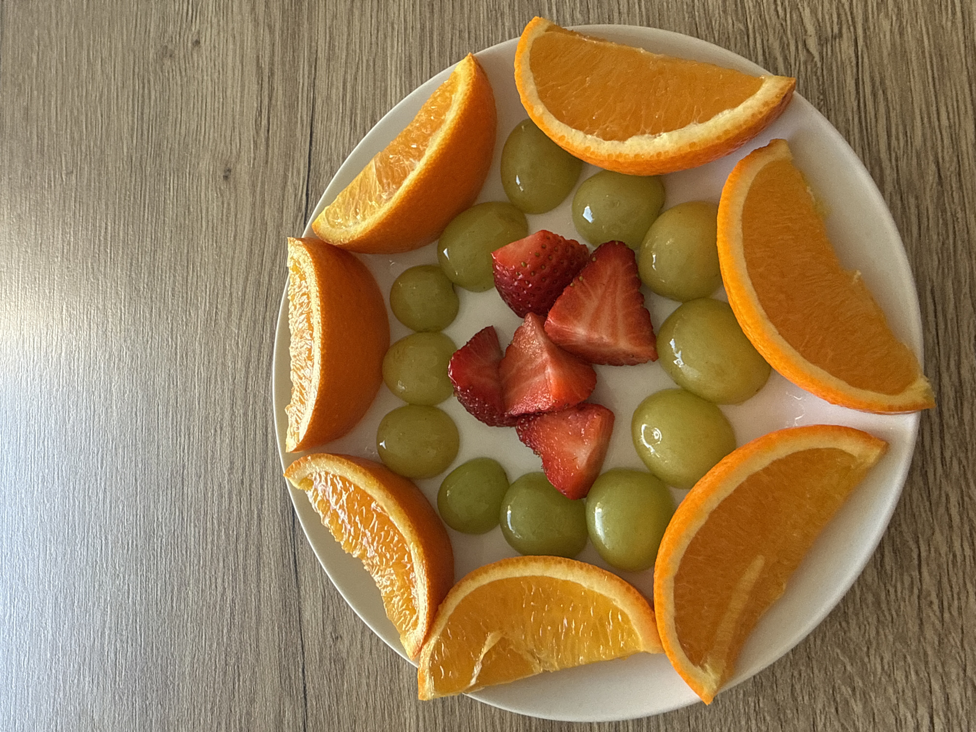 - "A white plate containing fruit is positioned on a light brown, wood-grain surface" by FM-z8OuP2, licensed under CC BY 4.0