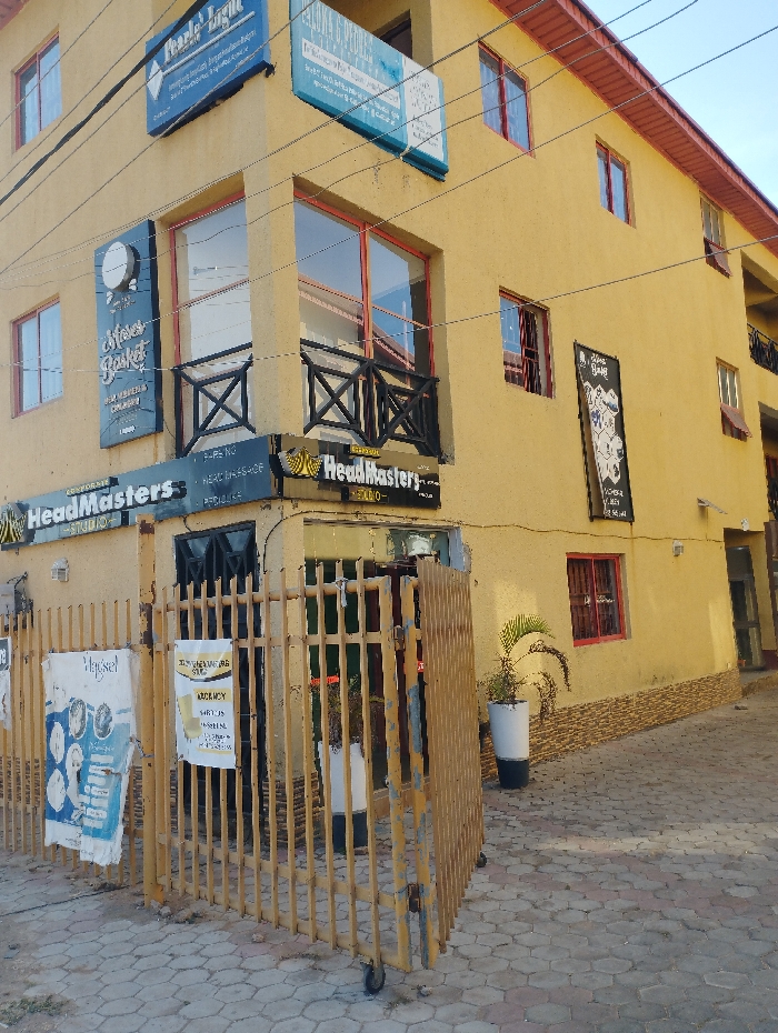The image displays the exterior of a three-story, ochre-colored commercial building located in Gura Top, Nigeria
