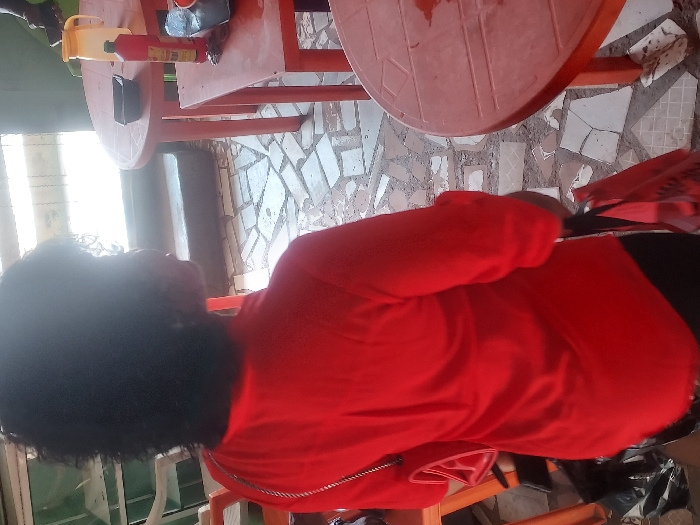 An individual is depicted from a slightly elevated rear perspective, standing or walking within what appears to be an indoor or semi-outdoor establishment. The person has dark, curly hair and is wearing a long-sleeved red shirt and dark trousers. A red shoulder bag with a silver-colored chain strap is visible on their right side, and they are holding a red tote bag in their left hand. Their gaze is directed towards a brightly lit area in the background. The flooring is composed of light-colored, irregularly shaped tile fragments arranged in a mosaic pattern. Several orange or reddish-orange plastic tables are present; a partially visible round table is in the foreground to the right. Further back, a round table holds a yellow plastic pitcher, a dark rectangular container, and a red bottle. A rectangular table is also partially visible. In the background, a window or opening with horizontal slats allows bright light into the space. A portion of a green wall is visible on the upper right side. The specific location in Obosi, Nigeria, cannot be confirmed solely based on the visual evidence provided.