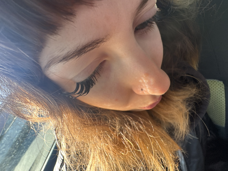 The image presents a close-up, angled portrait of an individual's face, taken in Kazanlak, Bulgaria. The subject's head is tilted, with the face oriented downwards and slightly to the right, suggesting the person is looking away or has their eyes closed. The right side of the face and left side of the hair are brightly illuminated by direct sunlight from the upper left. The individual has brown hair with prominent golden-blonde highlights, particularly visible on the left side. Dark, well-defined eyebrows frame the upper eye area. The eyes are not clearly visible, but long, voluminous dark eyelashes, consistent with false eyelashes, are prominent. The nose features a small, dark stud piercing on the left nostril. Several small, raised skin bumps or imperfections are present on the bridge and tip of the nose. A portion of the upper lip, appearing to be colored with pink or mauve lipstick, is visible. The lower left of the frame shows a dark garment, likely a jacket or hoodie, with a visible greenish-yellow textured lining. The background is blurred, suggesting a shallow depth of field, with bright light indicating an outdoor setting or a sunlit interior, possibly within a vehicle.