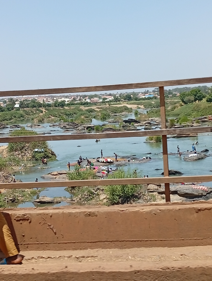 The image displays a wide view of a river in Nassarawa, Nigeria, observed from an elevated structure, likely a bridge