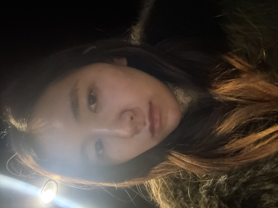 A young woman's face is centered, angled slightly towards the camera. Her skin is light with minimal visible makeup. Dark eyebrows and eyes are prominent features. Her hair is dark, transitioning to reddish-brown highlights near the ends, surrounding her face. She wears a dark, furry garment, possibly a coat or jacket. A bright light shines from the bottom left corner, creating a lens flare effect. The background is dark, suggesting a nighttime setting.