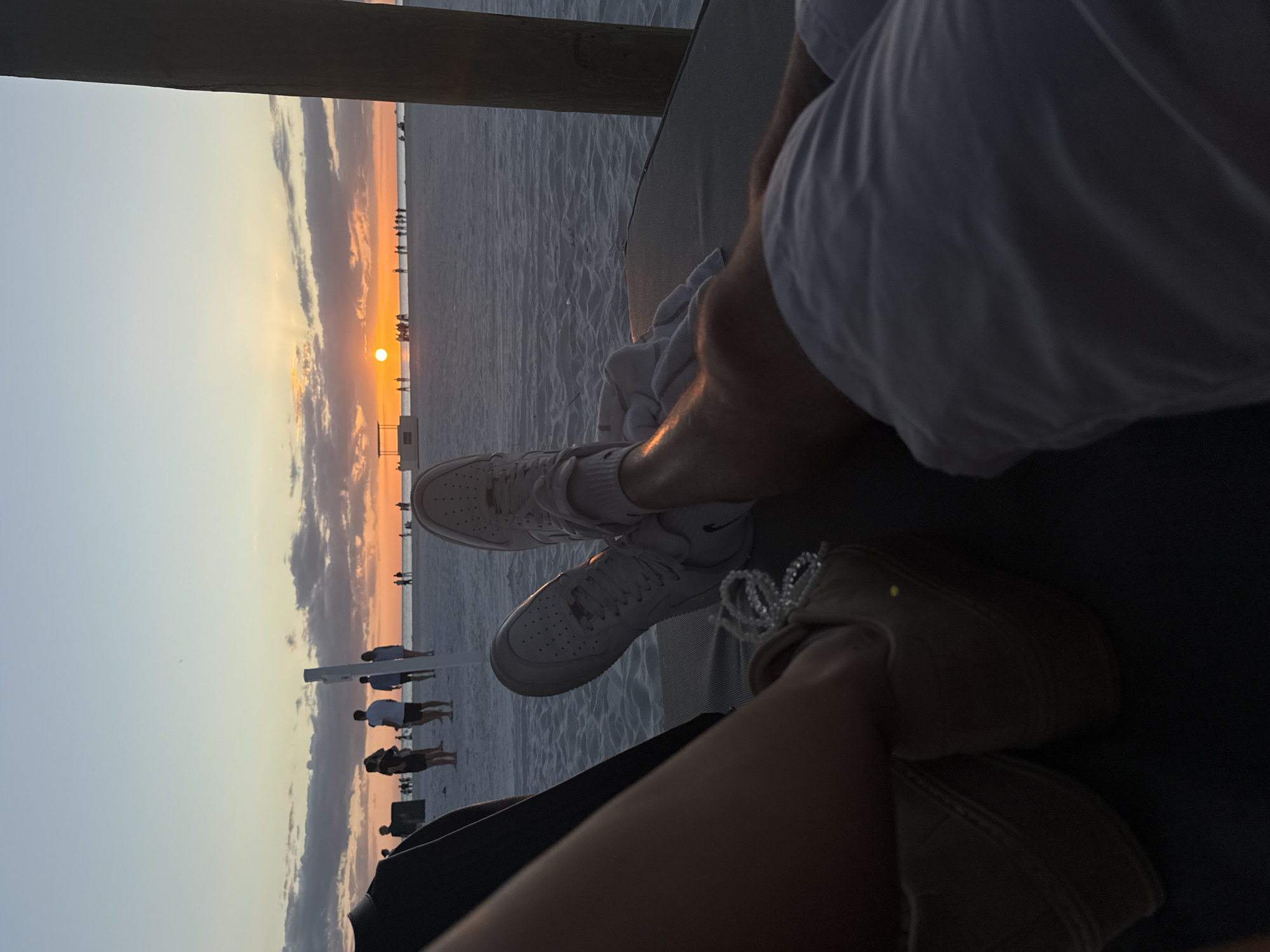 This image captures a sunset scene at Marco Island, Florida, United States. Two individuals are present, identifiable by their legs and footwear. One person is wearing white sneakers, while the other sports tan-colored shoes. People are silhouetted against the setting sun on the beach. The ocean stretches out to the horizon. The angle of the photograph suggests it was taken from a low vantage point, possibly a lounge chair. A wooden post is visible in the upper left corner of the frame.