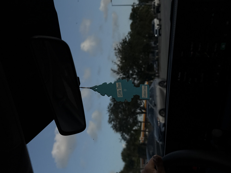 The image captures a daytime scene from within a vehicle, located in Aventura, United States. A teal, pine tree-shaped "Little Trees" air freshener, labeled "Caribbean Colada," hangs centrally from the rearview mirror support structure. The vehicle's dark dashboard and a portion of its infotainment screen, displaying "Radio" and frequency options, occupy the lower frame. A human hand, adorned with a ring on the fourth finger, is visible on the left side, resting on what appears to be a steering wheel or dashboard. Through the windshield, an outdoor environment is visible under a blue sky with scattered white cumulus clouds. Multiple vehicles are present in the midground, including a silver sedan parked or slowly moving in the center-left, and several white SUVs/trucks further back to the right. In the background, a distinctive yellow and red Shell gas station canopy is discernible. The scene is populated by numerous mature green trees, indicative of a developed urban or suburban landscape. No explicit human figures or active interactions are directly observed beyond the hand inside the vehicle.