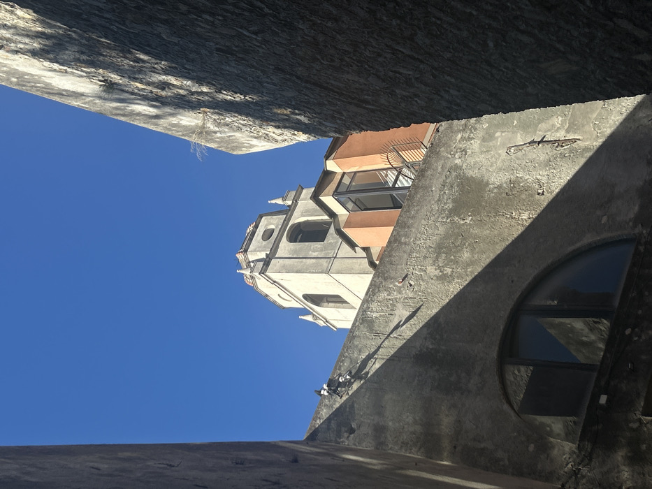 The image depicts a steep, narrow view upward from a shadowed alleyway in Genoa, Italy