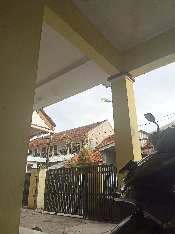 view from under a porch, looking out towards a black motorcycle, a metal gate, and a residential building. The porch is covered by a yellow ceiling. The motorcycle is a Yamaha, with its front wheel and handlebars visible. The gate is black metal, with vertical bars. Behind the gate is a building with brown tiled roof, surrounded by lush greenery. The building has multiple floors and a balcony. The sky is visible through the roof and the porch. A street light is on in the background. The image was taken in the city of Tasikmalaya, Indonesia, at the coordinates -7.358 latitude and 108.25 longitude.