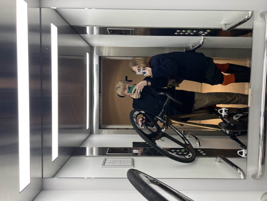 reflection in an elevator. Two people take a photo of themselves in the mirror. One person is next to a gold bicycle. The elevator features stainless steel walls with illuminated vertical panels and chrome handles. There's a control panel and a framed certificate on the side wall. The elevator floor appears light gray.