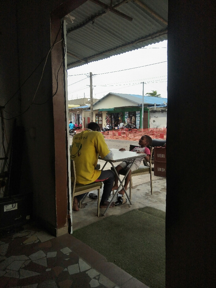 The image depicts an outdoor scene in Cotonou, Benin, viewed from a shaded interior doorway