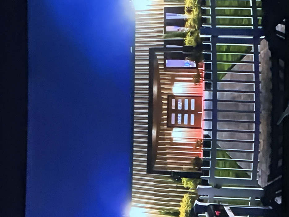 The image captures a nighttime exterior view of a modern building located in Vienna, Austria, under a deep blue sky. The building features a facade composed of numerous vertical, light-toned panels that are illuminated with warm white light. A central, recessed entrance is prominent, featuring dark double doors with horizontal opaque panels and a substantial dark, rectilinear canopy extending over it. This entrance area is intensely illuminated from below with a striking reddish-orange light, creating a distinct glow. A paved pathway extends from the foreground towards the entrance, flanked by manicured green lawns and landscaped shrubbery at the building's base. In the immediate foreground, a white, vertical-slat fence partially obstructs the lower portion of the view. No individuals or discernible activity are present within the frame.