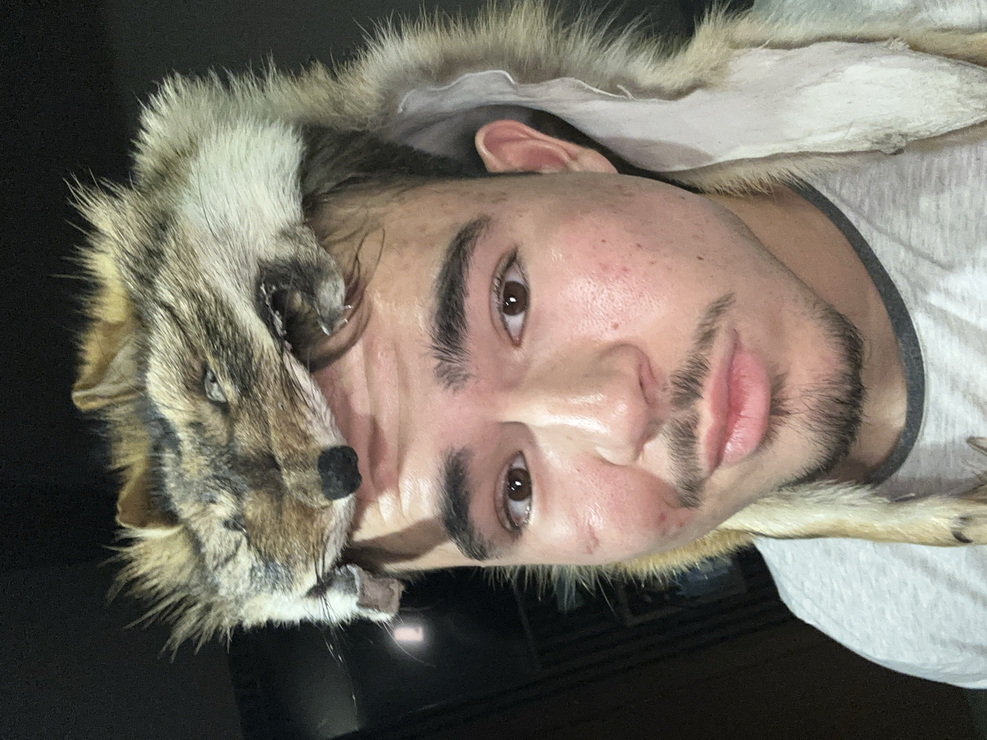 An image taken in the city of Voluyak, Bulgaria, depicts a male subject from the chest up, positioned centrally and facing directly forward. The subject, who appears to be an adult of approximate age 20-30, has short dark hair, dark brown eyes, thick dark eyebrows, a light-to-medium skin tone, and stubble forming a mustache and soul patch. Visible skin irregularities, including minor blemishes and a small scar, are present on his cheeks. He wears a light grey t-shirt with a darker grey collar trim. Affixed to the subject's head is a fur pelt, consistent with that of a canid such as a fox. The pelt's head, complete with snout, ears, and prominent whiskers, is situated on top of the subject's forehead. The fur exhibits a blend of brown, tan, and grey tones, with lighter, possibly white, fur visible on the underside near the subject's right ear (viewer's left). The reverse side of the pelt, showing the white-colored skin, is visible draped against the subject's hair and right shoulder. The subject's lips are slightly pursed, and his gaze is directed towards the camera. The background is dark and indistinct, suggesting an indoor environment with limited ambient light.