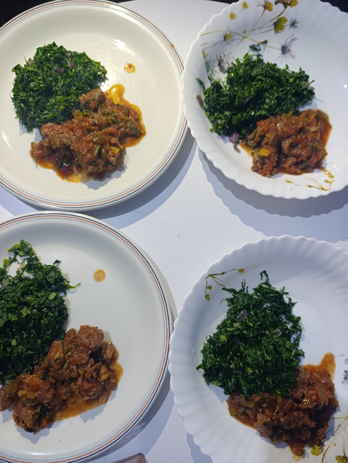 Four plates hold portions of food. Each plate contains a serving of dark green leafy vegetables and a stew-like dish. The plates are predominantly white, with two having floral patterns around the edges and two featuring simple red and blue concentric circles. The food is arranged side-by-side on each plate, with the stew appearing brownish-red in color. The entire composition is set against a bright, white surface.
