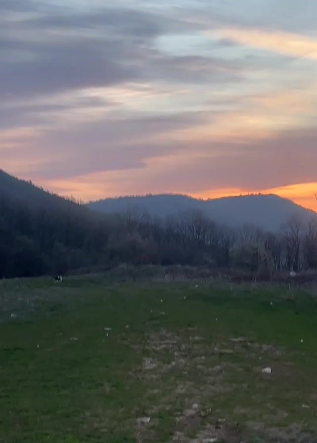 landscape with rolling hills and a dramatic sunset sky. The hills are covered in trees that appear to be bare, suggesting it's either late fall or winter. A grassy field is in the foreground, with a few animals grazing. As the video progresses, a small portion of a dark-colored car comes into view at the bottom of the frame. The sky is filled with clouds tinged with orange, pink, and purple from the setting sun.
