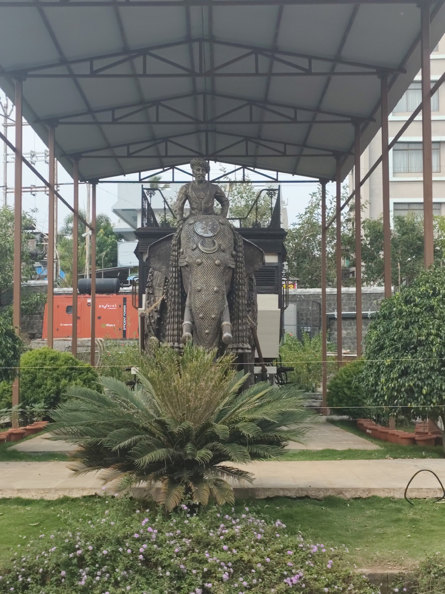 - "The image displays a large metal statue of a male figure riding a decorated elephant, situated under a grey, sloped metal canopy supported by brown metal pillars" by FM-L0pf82, licensed under CC BY 4.0