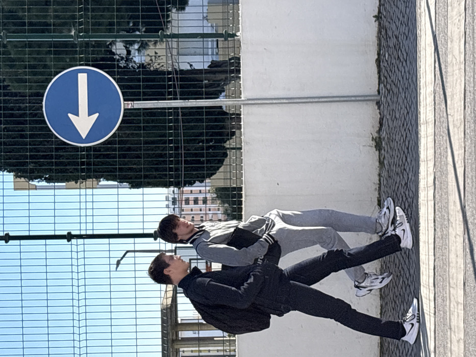 A daylight scene in Quarteira, Portugal, depicts two young males walking together from left to right on a cobblestone sidewalk. The individual on the left wears a dark long-sleeved shirt, dark pants, and white athletic shoes, carrying a dark backpack on his left shoulder. He faces slightly towards the second individual. The individual on the right wears a grey and black varsity-style jacket with grey sweatpants and white athletic shoes. He carries a dark rectangular object under his left arm. To the right of the individuals, a blue circular road sign with a white left-pointing arrow is mounted on a grey pole. Behind the subjects, a tall dark green metal mesh fence runs along the top of a white concrete wall. In the background, beneath a clear blue sky, are dark green trees and multi-story buildings. Bright sunlight illuminates the scene.