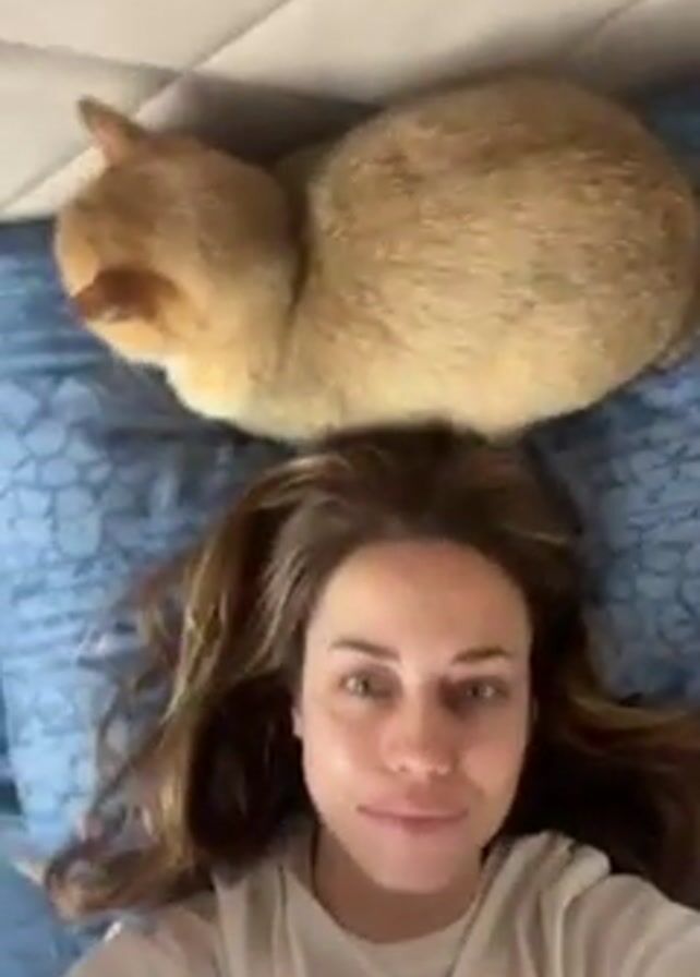 A woman is lying in bed, filming herself with a camera pointed directly at her face. A tan cat is lying on a blue pillow, directly behind the woman’s head. The woman’s eyes are closed. The woman opens her eyes and moves the camera to the side slightly, then back. The cat stares directly forward. The woman shifts around on the bed.