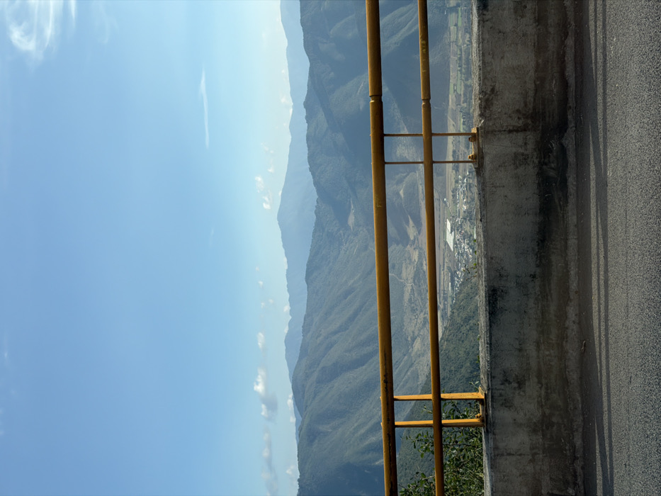 A vertical shot showcases mountainous terrain against a bright blue sky with scattered clouds. A yellow railing runs vertically, anchored to a concrete barrier that parallels an asphalt road. Below, a valley reveals a small village. The hazy mountains recede into the distance, adding depth to the scene.