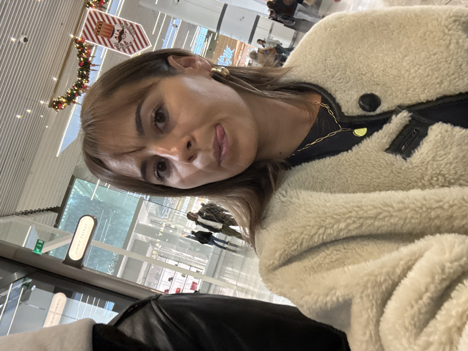 The image captures a woman inside a modern shopping mall, identified as Cap3000 in Saint-Laurent-du-Var, France. The woman is centered in the foreground, exhibiting light brown hair with bangs. She wears a cream-colored, textured jacket with black trim and a single prominent black button, over a dark garment, accessorized with gold-toned hoop earrings and a gold-colored chain necklace featuring a circular pendant. Her tongue is slightly extended from her mouth. To the far left, a dark-colored garment is partially visible. In the background, a "JIMMY FAIRLY" store sign is prominently displayed above a glass storefront showcasing merchandise. Multiple individuals are visible, blurred, walking on a light-colored, reflective floor. Overhead, the environment is decorated with festive garlands featuring green foliage and red ornaments, along with a large banner depicting a Nutcracker face with a striped background, indicative of a holiday season. The ceiling is white and features modern lighting elements.