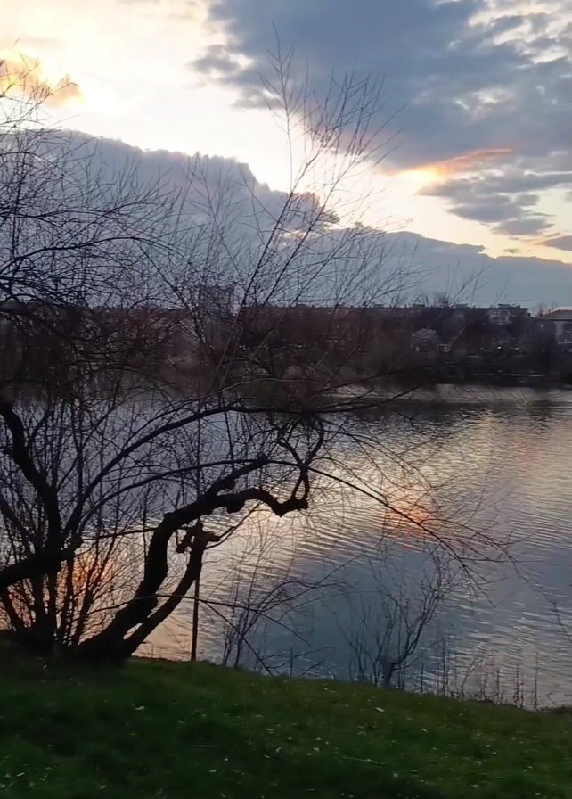 tranquil lake at sunset, with a fountain in the middle of the water spraying water upwards. The foreground features green grass on the bank of the lake, and silhouetted branches of bare trees are framing the view. The sky is filled with clouds, tinged with orange from the setting sun. In the background, buildings are visible across the lake. The water reflects the colors of the sky and the surrounding landscape. There is gentle movement in the water creating ripples.