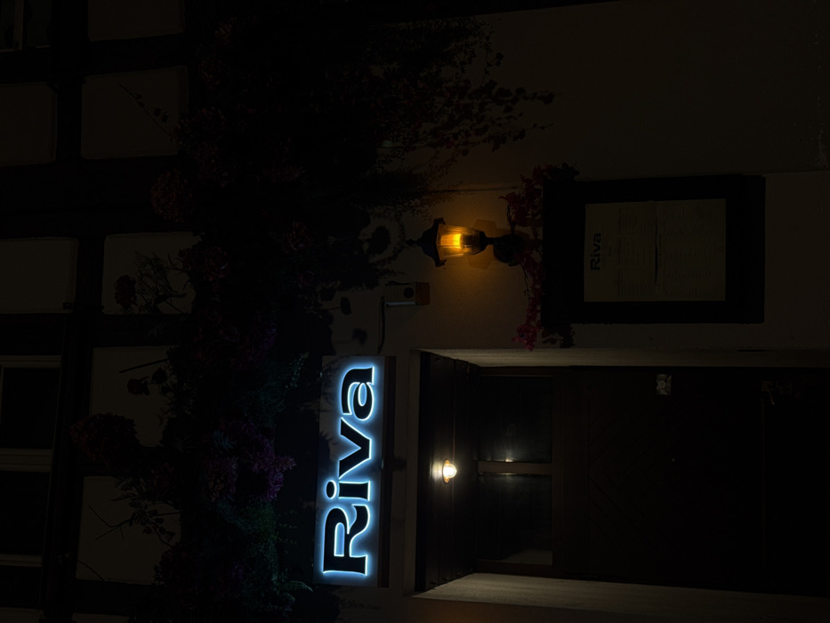 A dimly lit exterior shows the "Riva" sign, illuminated in bright white and blue