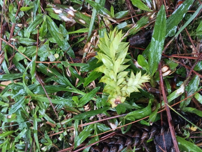 patch of ground covered in various greenery. Primarily, there is lush green grass with slender blades. Scattered amongst the grass are brown pine needles and other organic debris. A small, light green plant with tiered, scale-like leaves stands out against the surrounding grass, drawing the viewer's eye. The scene appears slightly wet, with a sheen on the leaves.