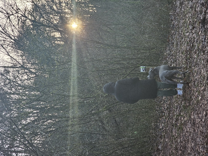 In a wooded area, a person in a dark coat and light pants walks with a gray dog on a leaf-covered path. The sun shines through the trees, creating a bright spot in the sky. A green and white sign stands near the path. The person and dog are facing away from the camera. The trees are bare.