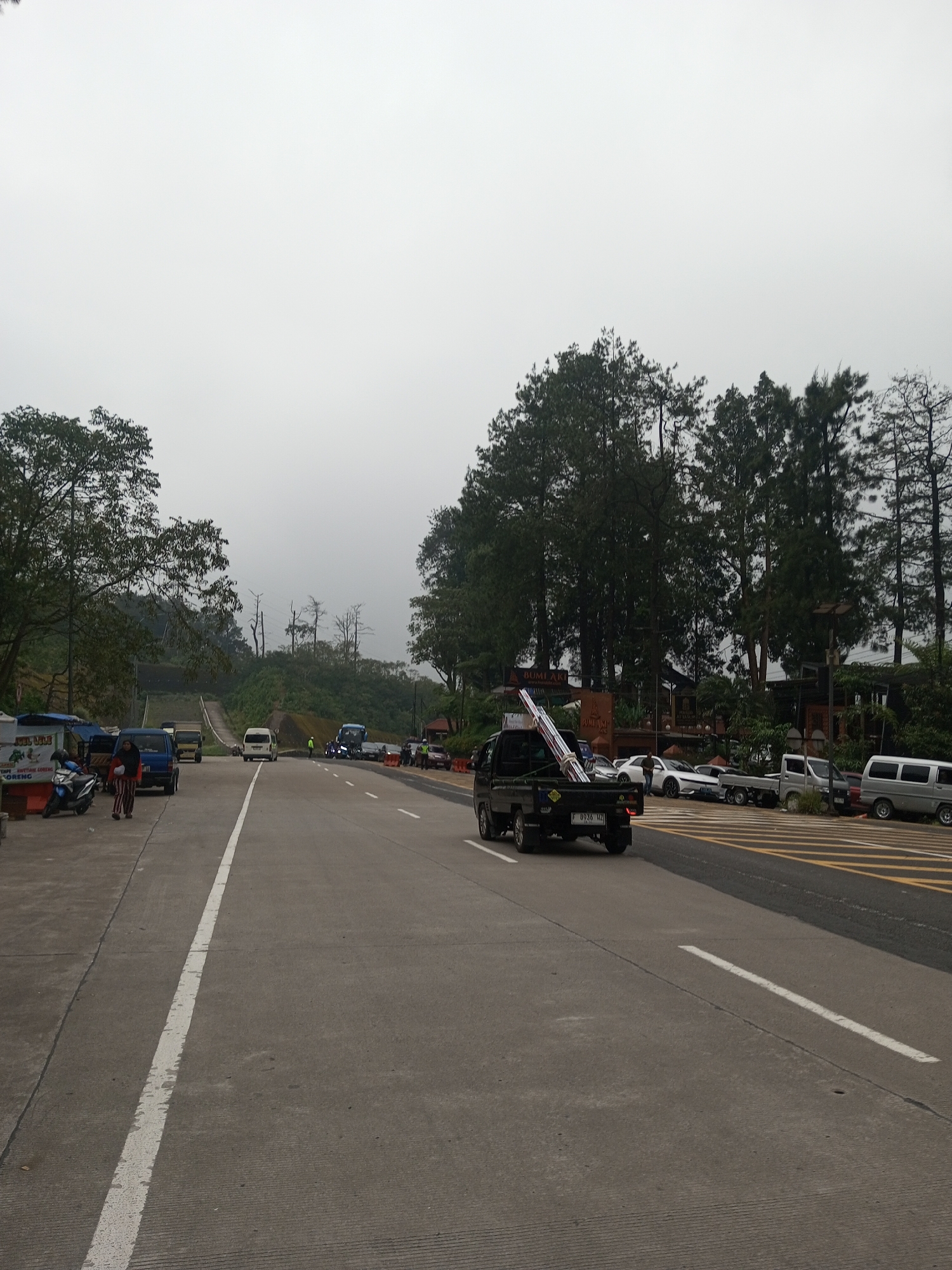 road scene in Mae Chan District, Thailand, characterized by an overcast sky. The road, marked with white lines, has various vehicles present including a black pickup truck carrying metal poles, a white van, and several smaller cars. On the side of the road, there are shops, trees, and some parked vehicles, including a motorcycle. People are visible near the shops. Further up the road there is a bridge. The environment includes trees and hills.