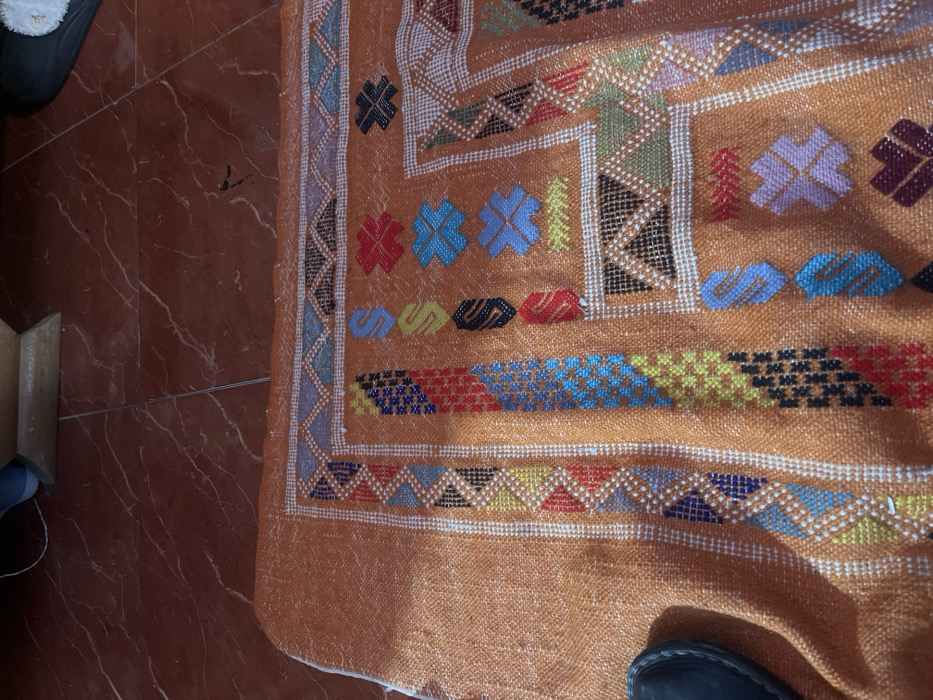 An orange Berber rug with geometric patterns sits on a tiled floor. The rug features colorful designs, including cross shapes, zigzags, and horizontal bands with triangles and colored beads. The rug's border is marked by a zigzag pattern. The floor is reddish-brown with a marble-like pattern. A pair of slippers and a shoe are visible on the floor.