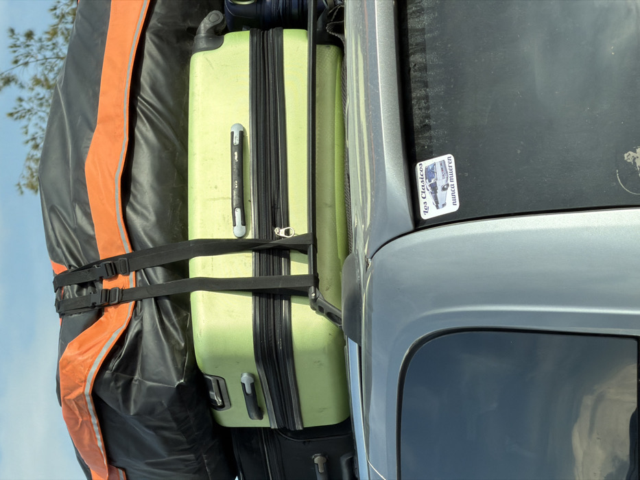 Luggage secured on top of a vehicle includes a black duffel with orange accents and two suitcases, one light green and another dark. Black straps fasten the luggage. A sticker on the vehicle's roof reads "Los Clasicos nunca mueren" with a vintage car graphic. The car is silver, with a dark window reflecting the sky.