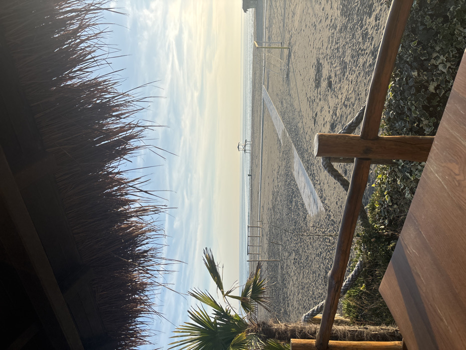 The image depicts a wide view of a sandy beach and the Adriatic Sea in Donji Štoj, Montenegro, captured from beneath a thatched roof structure. The foreground features a partial wooden tabletop on the lower-left and a rustic wooden railing, comprising posts and intertwined rope, backed by green foliage, spanning the lower portion of the frame. The midground reveals an expansive, light brown sandy beach with numerous visible footprints. A single palm tree stands on the left. On the beach, four wooden posts, likely for a net, are present in the left-center. Two parallel light-colored pathways extend across the sand, leading towards the water. A small white-framed soccer goal with a net is positioned on the right side of the beach. Further out near the waterline, a two-tiered wooden lifeguard tower is visible on the far right. The background displays the calm, pale blue expanse of the Adriatic Sea merging with a distant horizon under a bright sky with sparse, wispy white clouds, indicating soft daylight conditions. No individuals are discernible within the visible scene.
