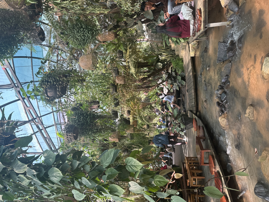 A lush greenhouse setting with hanging plants and various foliage is populated with people. Some are seated at wooden tables and chairs near a winding stream, while others are enjoying the water by dangling their feet in it. A pathway runs alongside the stream, and the overhead structure lets in natural light. The overall ambiance is relaxing and verdant.