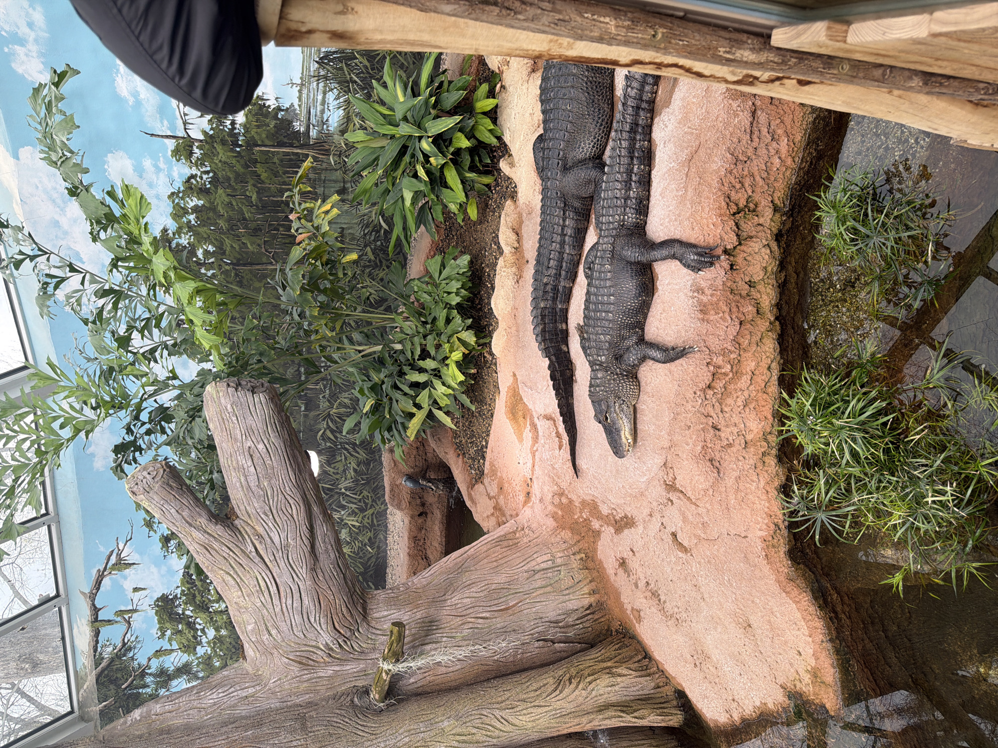 The image depicts two alligators lying on a reddish-brown rock formation next to a body of water with aquatic plants. The alligators are dark in color, with visible scales and textures. Lush greenery surrounds the rock, and a painted backdrop featuring trees and a sky with clouds can be seen in the background. The scene appears to be indoors, potentially within a controlled environment like a zoo or aquarium. The presence of wood and glass structures indicates a viewing area for visitors. This scene is from the Gondwanaland hall at the Leipzig Zoo, Germany.