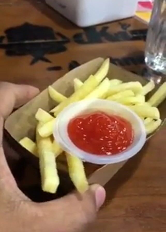 - "A hand holds a small cardboard container filled with french fries and a small plastic cup of ketchup" by FM-XQUXv1, licensed under CC BY 4.0