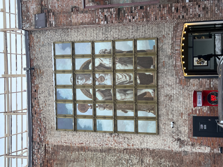 The image depicts the brick exterior of a building at Sevkabel Port in Saint Petersburg, Russia. A large, multi-panel art installation dominates the upper central portion of the wall, presenting a classical male figure in a seated, regal posture, holding a scepter inscribed with "SEND" and wearing a prominent medallion. This figure is composed across 24 individually framed panels, arranged in a 6x4 grid, with sections of cloudy sky visible in some panels. The building itself is constructed from variegated red and pale brick. The rooftop features exposed wooden scaffolding or framing, partially covered with snow. At ground level, beneath the art installation, an arched entryway on the right is illuminated by a string of bare bulbs, leading into a dark interior where a person in dark clothing is visible walking right-to-left. To the left of this entrance, a red "ROCKY BOXER" arcade machine displays "320" on its digital readout. Further left, a dark grey door is set into the brickwork. Two white security cameras are mounted on the wall above the arcade machine. The upper edge of a dark vehicle is visible in the lower foreground.