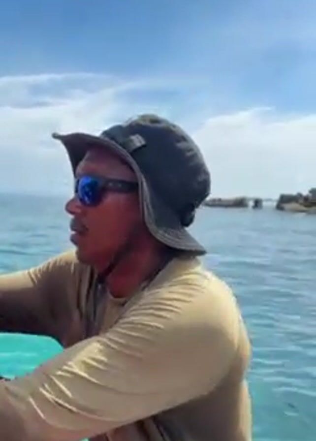 A man wearing a floppy hat and sunglasses sits in a boat, facing the right side of the frame. The man is wearing a tan long-sleeved shirt. The clear turquoise water is visible in the foreground. In the background, a small, rocky island with some trees on top is visible. Behind the island, a larger landmass can be seen in the distance. The sky is blue with scattered white clouds. The camera pans from left to right to capture the scene.