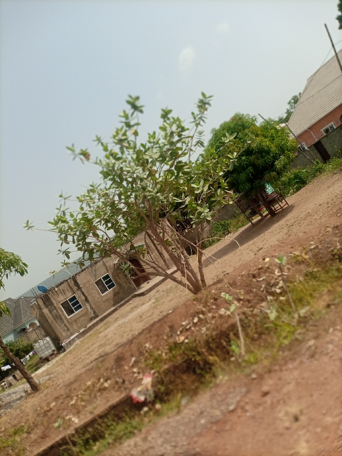 The image depicts an outdoor scene in Adankolo, Nigeria, under a bright, clear sky with minimal cloud cover. The ground is primarily reddish-brown earth, sloping gently from the foreground towards various structures in the mid-ground and background. In the immediate foreground, a narrow, shallow ditch or eroded path runs horizontally, containing sparse green weeds and a small piece of red and white refuse, possibly a plastic wrapper. A central, deciduous tree with multiple light brown trunks and numerous green leaves dominates the mid-ground. To its left, a single-story, unpainted concrete building with a greyish hue stands on level ground. This building features two rectangular windows with white frames and a brown wooden door. A blue satellite dish is mounted on its flat roof. Further to the left, partially obscured, is a building with a grey tiled roof, and a white rectangular object, possibly a water tank, is visible, with clothes hanging on a line nearby. To the right of the central tree, another dense green tree is visible. Beyond it, a reddish-brown tiled roof of another building can be seen in the upper right quadrant of the image. A wooden structure, resembling a small cart or stand, is faintly discernible beneath the dense green tree. No people, specific actions, or interactions are visible within the frame. The overall impression is a residential or semi-developed area under daylight conditions.