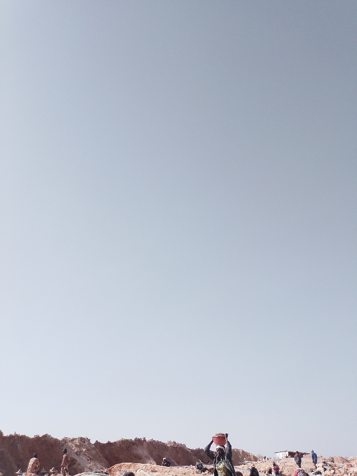 The image portrays an active open-pit mining or excavation site in Jos, Nigeria. Approximately 80% of the frame is occupied by a clear, pale blue sky. The remaining lower portion depicts a landscape of disturbed earth, characterized by light brown, reddish-brown, and orange hues, with prominent mounds and excavated areas. Multiple individuals are engaged in manual labor throughout the scene. In the lower right foreground, a person is visible carrying a red bowl filled with reddish-brown material balanced on their head. Other workers are distributed across the middle ground, interacting with the earthen terrain. To the far right, a small, indistinct structure or shelter is present, and a lone figure in blue clothing stands in the distance. The overall scene depicts ongoing manual earth-moving activities.