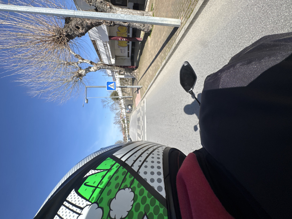 The image depicts a first-person view from a motorcycle on a paved road in Mirandela, Portugal, on a clear, sunny day. In the immediate foreground on the left is the rear-left side of a white motorcycle helmet with a pop-art style green, black, and white graphic design featuring jagged shapes, cloud-like elements, and halftone dots. Below the helmet, a maroon fabric, likely from a garment, is visible, resting on a black textured surface, possibly a motorcycle tank bag or seat. To the right of the black surface, a black motorcycle rearview mirror is visible, and the shadow of a helmeted rider is cast on the road and the motorcycle. The road ahead features a pedestrian crossing marked by alternating dark and light gray rectangular patterns. A blue rectangular road sign with a white pedestrian symbol is positioned on the right side of the road. Further down the road, vehicles are parked along both sides. The right side of the road has a concrete sidewalk lined with several large, bare deciduous trees. Behind these trees, a long, low white building with graffiti in red and yellow is visible. The left side of the road features a low white wall, with more trees and buildings in the distance. The sky is bright blue and cloudless.