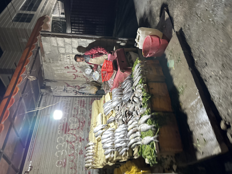 A fish market vendor in a red jacket squats near his stall. He holds plates, possibly for weighing or displaying fish. The stall is stocked with rows of small, silver fish, stacked on wooden crates and interspersed with green sprigs, possibly herbs for freshness. A red crate and containers sit nearby. The backdrop features a building with a partially shuttered storefront and graffiti-like marks on the wall.