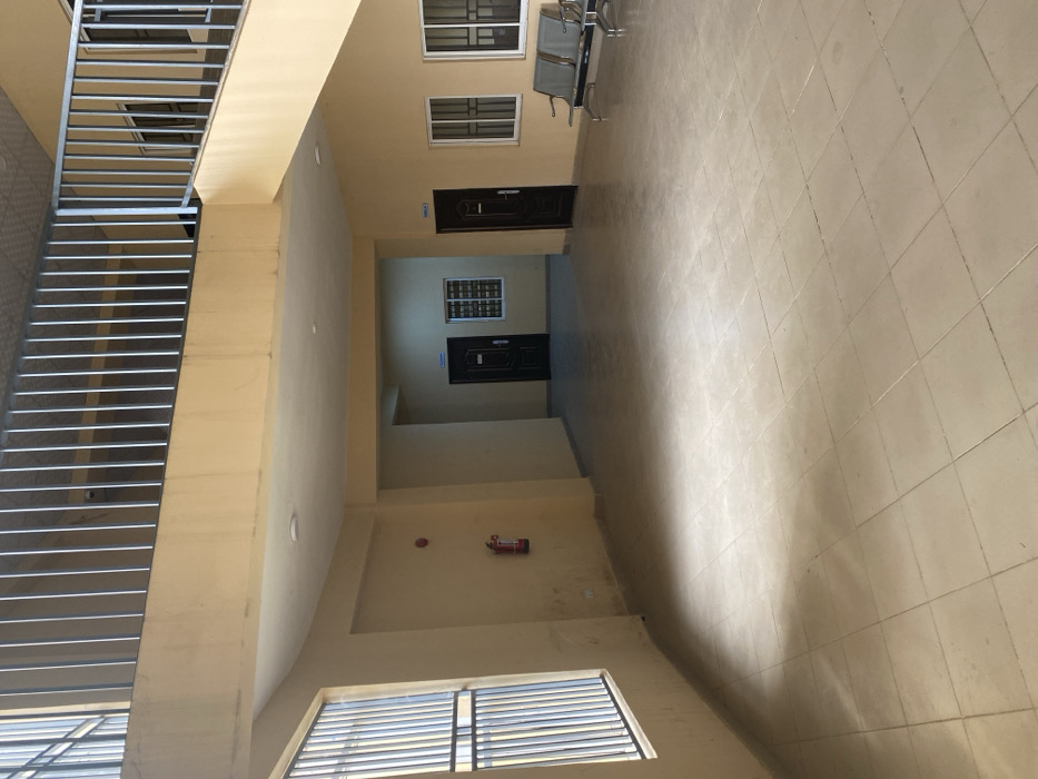The image displays an empty, indoor, multi-level public area in Rijiyar Zaki, Nigeria. The space features light yellow-painted walls and a beige-tiled floor with visible grout lines. A mezzanine level with silver metal railings overlooks the ground floor, supported by a light yellow concrete structure. On the ground level, a large window with vertical metal bars is visible on the left, allowing natural light to enter and cast shadows across the floor. A red fire extinguisher is mounted on the curved wall beneath this window. In the background, two dark brown doors with embossed panels are visible, leading into interior spaces; a blue rectangular sign is affixed above the door on the left. To the right, another dark brown door is present, accompanied by two windows with white frames and metal grates. A three-seater metal waiting bench is positioned to the right of these windows. A small black security camera is visible on the upper-level wall, near the railing. No individuals are present in the scene, and no actions or interactions are depicted.