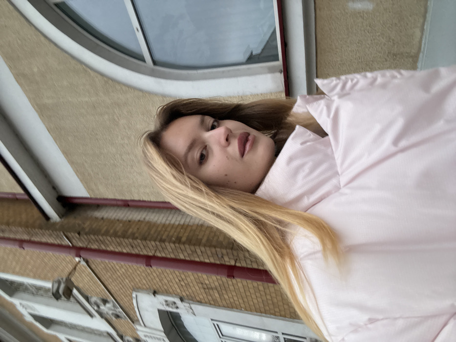 A young adult female is positioned slightly right of center, looking towards the camera with a neutral expression. She has long, straight light blonde hair and is wearing a light pink, puffy winter jacket with a high collar. The background features two distinct building facades under overcast conditions. To the left, a light brown brick building displays a vertical red drainpipe, a partial white-framed window, and ornate decorative architectural details below it. To the right, a light beige stucco building facade prominently features a large, arched window with a white frame, reflecting a cloudy sky. This architectural detail identifies the building with the arched window as part of the monastic complex of the Franciscan Church (Church of the Annunciation of the Blessed Virgin Mary), located at 1 Karla Marksa Street, Hrodna, Belarus. The adjacent brick building is part of the immediate surroundings in this area of Hrodna.