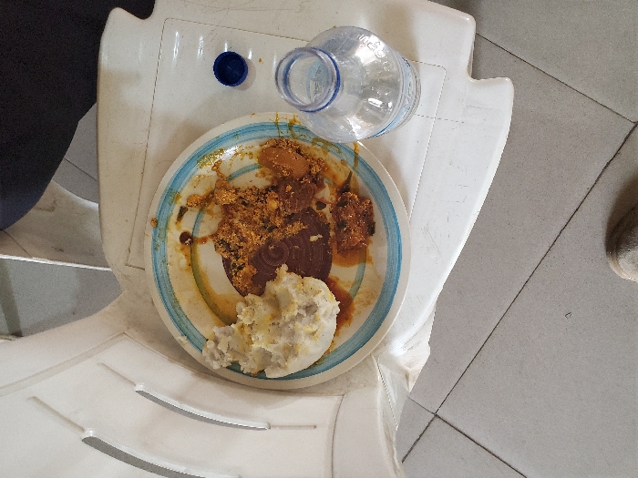 The scene depicts a partially consumed meal and a beverage bottle, set on a white plastic chair within a tiled indoor environment in Lokoja, Nigeria