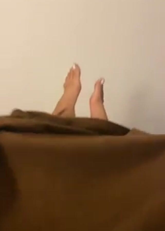 A close-up shot shows a person lying down, covered with a brown blanket, with their feet raised and angled towards the camera. The person's toes are painted white. The background is a plain, light-colored wall.