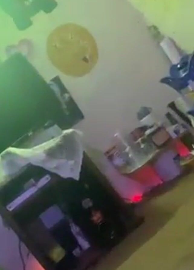 A person wearing jeans and a blue shirt is lying on what appears to be a floor in a room. There is a television stand with a TV and other objects on it, along with shelves and other furniture in the background. Multicolored lights are visible throughout the room. The camera angle is tilted.