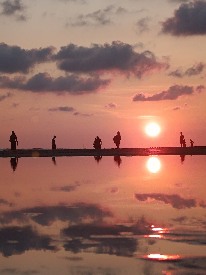 The image depicts a sunset over a beach in Kathaluwa, Sri Lanka. The sun, a bright orange-yellow orb, is positioned low on the horizon, slightly right of center. The sky displays a gradient of orange, pink, and light purple hues, containing scattered dark grey stratiform clouds with some pink illumination. A tranquil body of water occupies the foreground, perfectly reflecting the sun, sky colors, and clouds. Seven human figures are visible in dark silhouette, standing on a narrow, horizontal strip of land that separates the foreground water from the ocean beyond. From left to right, the figures are positioned as follows: 1. One standing figure. 2. One standing figure with their head angled downwards. 3. Two figures: one appearing to kneel or crouch, the other standing immediately adjacent. A small, indistinct dark object is present on the land strip near these figures. 4. One figure walking, carrying an item over their left shoulder. 5. One standing figure. 6. One smaller figure, likely a child, standing near the fifth figure. All figures cast distinct, dark reflections in the calm foreground water. Small ocean waves are discernible along the distant horizon beyond the land strip.