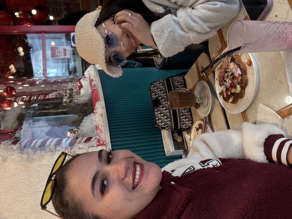 Two women are seated at a table inside a festive cafe or dessert shop in Kadıköy, Turkey. The environment features a display window or cabinet in the background, adorned with red and white candy canes, faux snow, miniature Santa Claus figures, and red spherical ornaments, suggesting a holiday theme. Teal-colored ribbed paneling is visible beneath the display. The woman in the foreground, positioned on the left, is a young adult with dark hair, dark eyebrows, and bright red lipstick, smiling directly at the camera. She wears a maroon and cream-colored fleece jacket with striped cuffs, and yellow-tinted sunglasses are perched on her head. The woman in the background, positioned on the right, is a young adult wearing a cream-colored, fuzzy bucket hat and light-blue tinted rectangular sunglasses. She also appears to be smiling subtly and rests her chin on her left hand, which displays a ring on the ring finger. Her attire includes a light-colored fuzzy jacket. On the light-colored table between them, a white plate holds a partially consumed waffle or pancake topped with sliced bananas, various fruits, pink cream, and sprinkles, accompanied by a fork. A clear glass mug containing a dark brown beverage, likely hot chocolate, sits on a white saucer. Adjacent to this is a black and beige Dior Oblique pattern bag. A tall, pink, empty or near-empty glass with a straw and a partially visible dark mobile phone are also on the table. A white "Waffles" dispenser is visible in the background behind the woman on the left.
