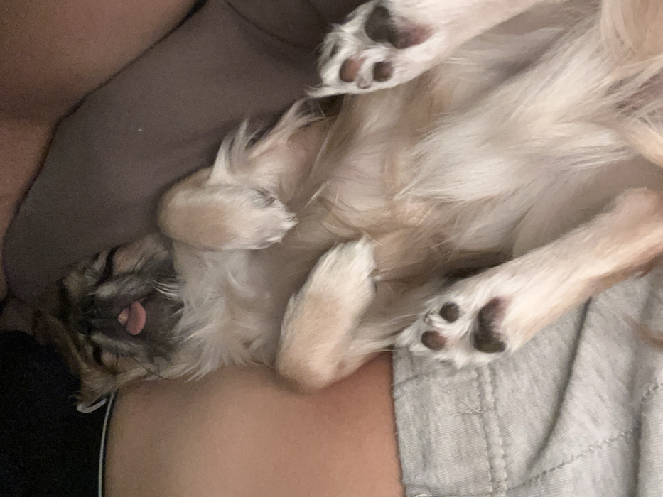 A small, long-haired dog, primarily light brown and cream, is depicted lying on its back with its eyes closed and a pink tongue slightly protruding