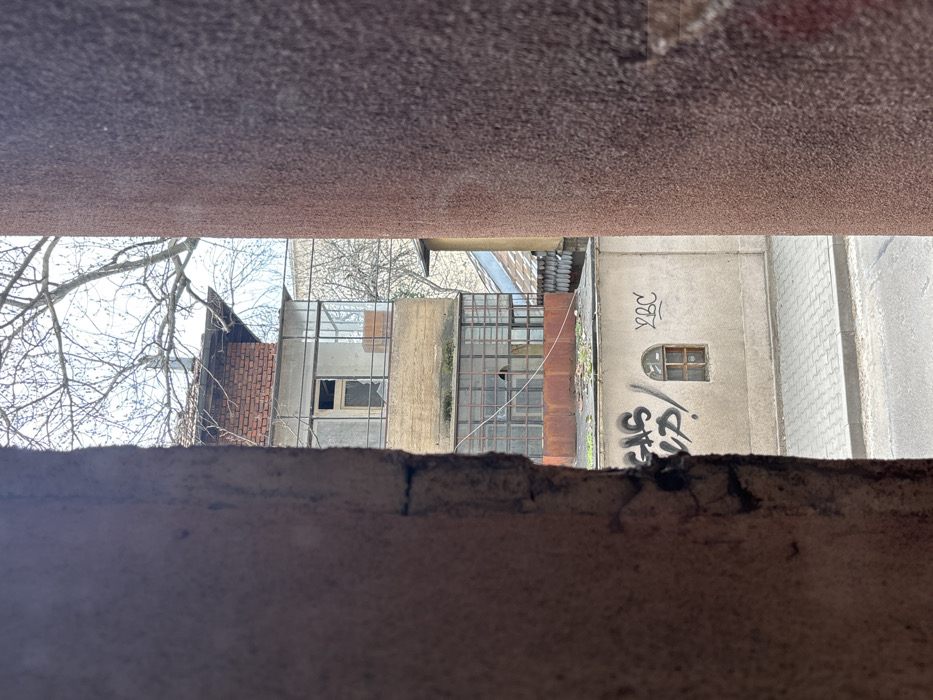 - "The image displays a vertical urban view in Sofia, Bulgaria, framed by two rough-textured walls: a lighter brown wall on the left and a reddish-brown wall on the right" by FM-U7bYK2, licensed under CC BY 4.0