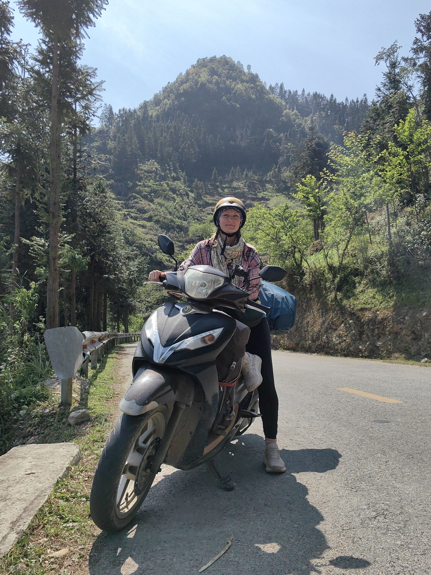 A woman wearing a helmet and a pink plaid shirt is sitting on a black scooter parked on an asphalt road. The scooter is facing the viewer. Behind her is a mountain covered in trees, the sky is clear and blue. The location is Lũng Cú Commune, Vietnam. There are tall trees lining the side of the road. A metal guardrail is visible on the left side of the road.