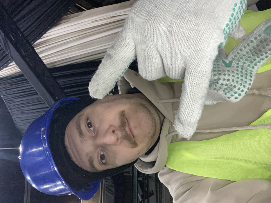 A male subject is depicted in a close-up selfie within an interior environment. He wears a blue hard hat over a black beanie, a beige hooded sweatshirt, and a neon yellow safety vest. The subject has a mustache and gazes directly at the camera. His gloved left hand, adorned with a white knit work glove featuring green rubberized dots, is raised with the index finger and thumb extended in a gesture. The background reveals dark overhead structural beams and vertical black and white fabric drapes, indicative of a stage or construction area. The specific location within Cukarica Urban Municipality, Serbia, is not identifiable from the visual evidence.